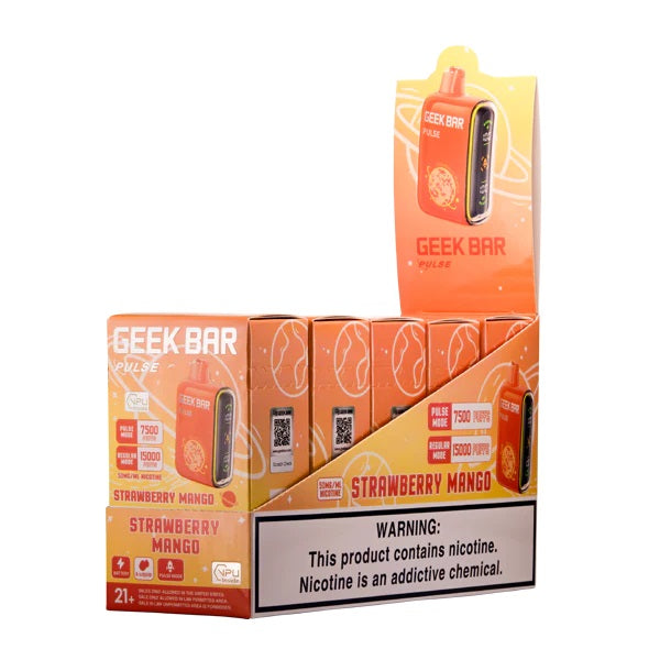 Shop the Strawberry Mango Geek Bar Pulse 15000, a perfect fusion of tropical mango and ripe red strawberry's sweet, tart essence. Enjoy this delightful blend of two of the most popular vape flavors in every refreshing puff.